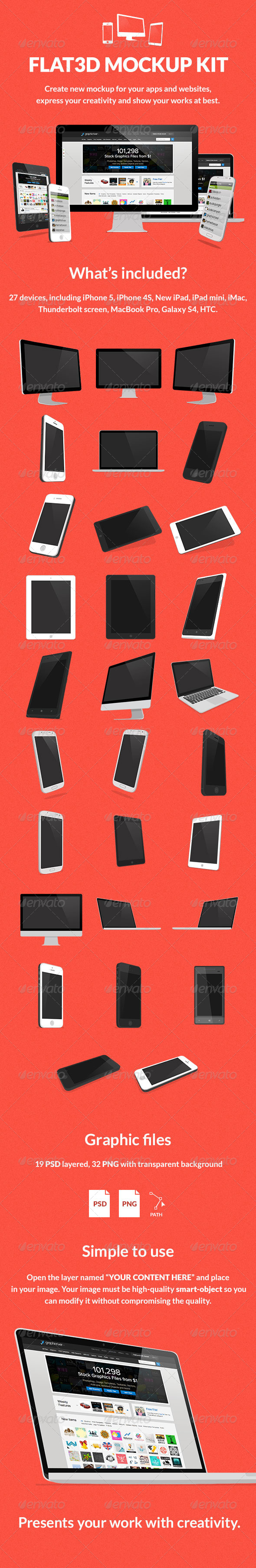 Flat3D Mockup Kit is a resource made of layered 19 PSD and 32 PNG transparent , very useful for designers who want to present their work in an original and amazing way.